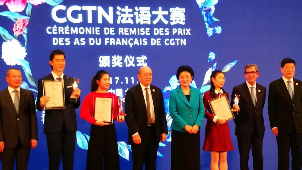 首届中国国际电视台(CGTN)法语大赛颁奖仪式同期举行。作为中法高级别人文交流机制的亮点活动,法语大赛由中国国际电视台法语频道组织,是一项面向全世界讲法语的中国人的大型赛事。法语大赛旨在鼓励和发现法语人才,促进中国与法语国家与地区的文化交流和友谊。本次大赛于3月20日正式启动,历时6个月。来自中国、法国和加拿大3个赛区的10名决赛选手中有三名法语系学生,其中一名在校生和两名毕业生:2015届本科毕业生张碧思同学夺得了本次大赛冠军,2016级张舒文同学取得了第五名的好成绩,2015届MTI翻译专业硕士毕业生马方同学获得第八名。以上三位同学通过展示语言能力、文化素养和个人魅力等比赛环节,经过层层选拔和激烈角逐,在本届法语大赛中展现了北外学子优秀的精神风貌和学业水平。