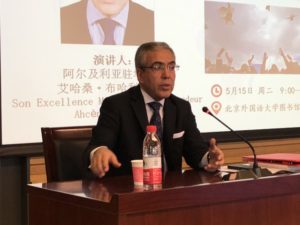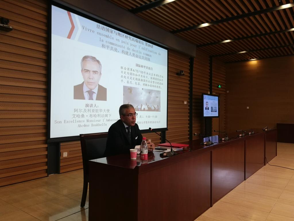 5月15日上午,阿尔及利亚民主人民共和国驻华大使艾哈桑·布哈利法阁下(Ahcène BOUKHELFA)应邀访问我校,并在我校图书馆五层会议厅发表了题为《和平共处——构建人类命运共同体》的演讲,以庆祝第一个“国际和平共处日”的到来。本次活动由我校法语系副主任王鲲主持。