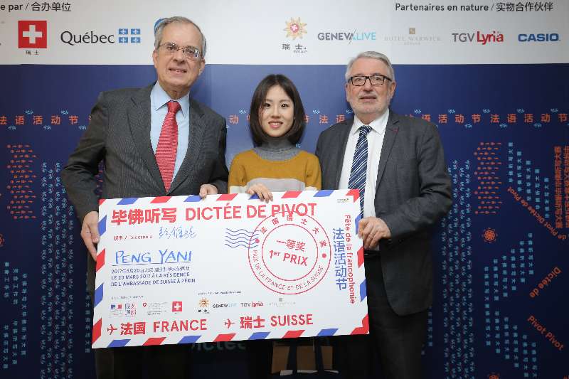为庆祝国际法语日,瑞士驻华大使馆、法国驻华大使馆及魁北克驻华办公室于2017年3月20日在瑞士驻华大使馆联合举办了中国第二届毕佛听写大赛总决赛。北外法语系大三年级彭雅妮同学获得本次大赛第一名,赢得法国瑞士双人文化之旅大奖。