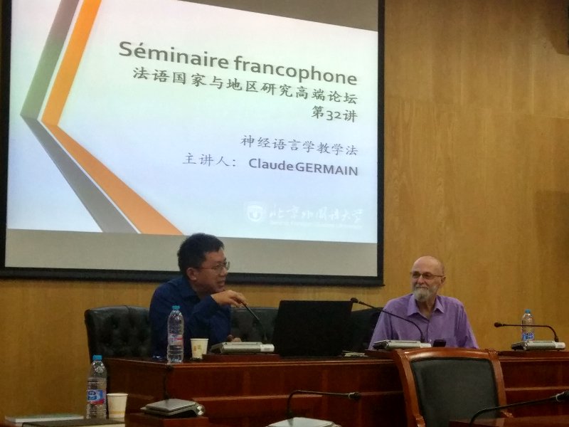 2017年9月27日周三下午2点,加拿大蒙特利尔魁北克大学教育科学院语言教学法系名誉教授、世界著名教学法学者克劳德·热尔曼先生(Claude Germain)应邀在北外模拟法庭做了题为“神经语言教学法:外语学习或习得的一种路径”的讲座。讲座由北外法语系傅荣教授主持。