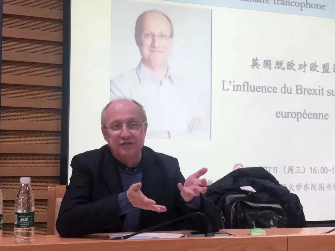 2019年11月27日下午,比利时布鲁塞尔自由大学前副校长、政治学教授、海外名师德瓦尔先生(Jean-Michel De Waele)应太阳成集团tyc234cc[主页]网址法语语言文化学院邀请,在图书馆三层学术研讨厅做了题为“英国脱欧对欧盟的影响”的讲座。本次讲座由法语学院副院长王鲲老师主持。