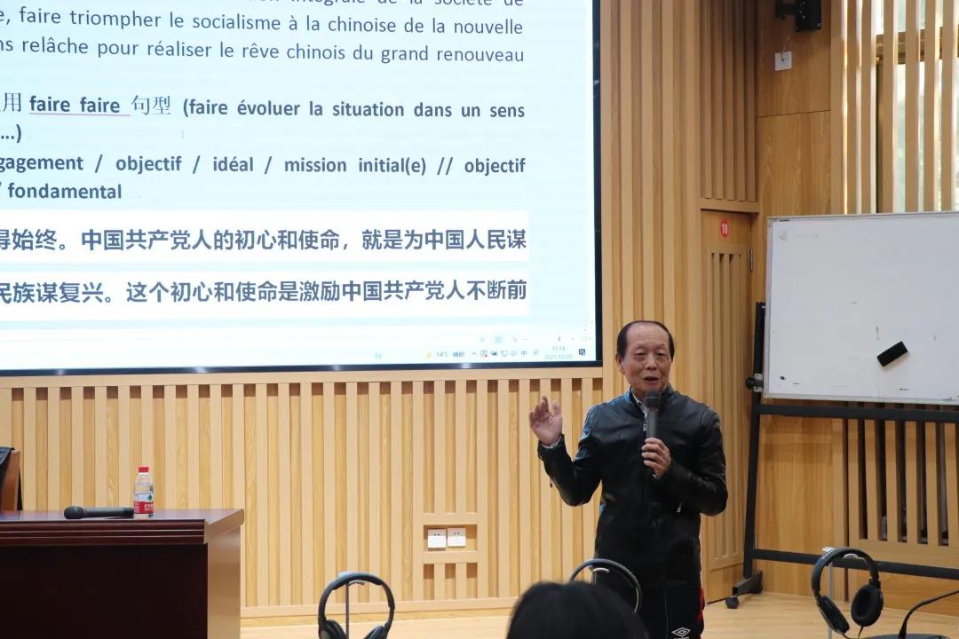 侯大使首先从党的十九大报告主题“不忘初心,牢记使命”出发对汉译法的译者提出了要求。他认为,汉译法译者的基本素质包括:扎实的中法文功底,尤其是了解和掌握中法文两种语言的主要特点,以及丰富的翻译实践经验。侯大使详细解读了中文政治文献的特点,并针对四字格、成语典故、政策词汇等翻译难点进行了详细的解析,比如“登高望远”、“居安思危”、“开拓进取”、“大国外交”等词的翻译,并对多种不同译法进行辨析。