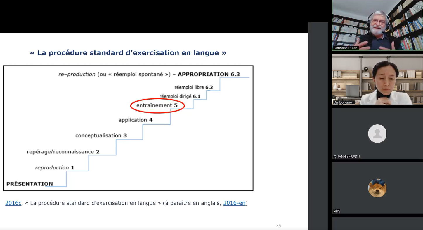 2022年11月16日下午,应北外法语语言文化学院邀请,世界知名的法国语言—文化教学法专家Christian Puren教授通过腾讯会议进行了题为“语言—文化教学法创新与技术创新——历史的视角与现实的挑战”的学术讲座,讲座由法语学院院长戴冬梅教授主持。