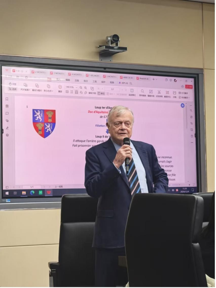 2024年12月4日下午,法国热尔省马尔桑市市长艾梅里·德·孟德斯鸠(Aymeri de Montesquiou-Fezensac d’Artagnan)到访我校,做了题为“一个穿越几个世纪的家族”的讲座。艾梅里·德·孟德斯鸠毕业于巴黎高等商业学院(ESCP),曾担任法国国民议会议员、参议员和欧洲议会议员,现任法国热尔省马尔桑市市长。此次,他应外交学会邀请访华,顺访我校,与法语学院同学们分享了法国最古老的贵族家庭之一——孟德斯鸠家族的历史。