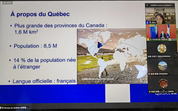 2022年11月23日下午15:00—17:00,加拿大魁北克政府驻北京办事处公共政治及行政事务顾问Frédéric Czor先生为北外法语学院师生举行了题为“魁北克,保护生物多样性的践行者”的精彩线上讲座。讲座由吉晶副教授主持。