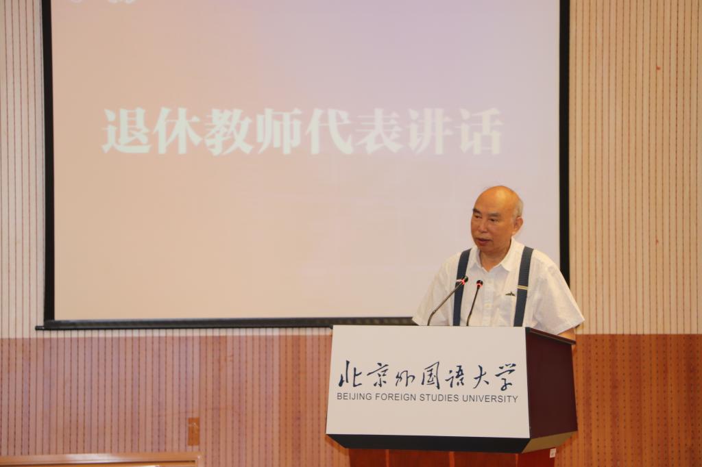 退休教师代表薛建成教授回忆了上世纪50年代的北外和法语学院,对教师队伍、教研目标等进行了今昔对比,为学院取得的成绩感到高兴,并鼓励年轻教师在压力和动力增大的条件下,做到健康和事业双丰收。