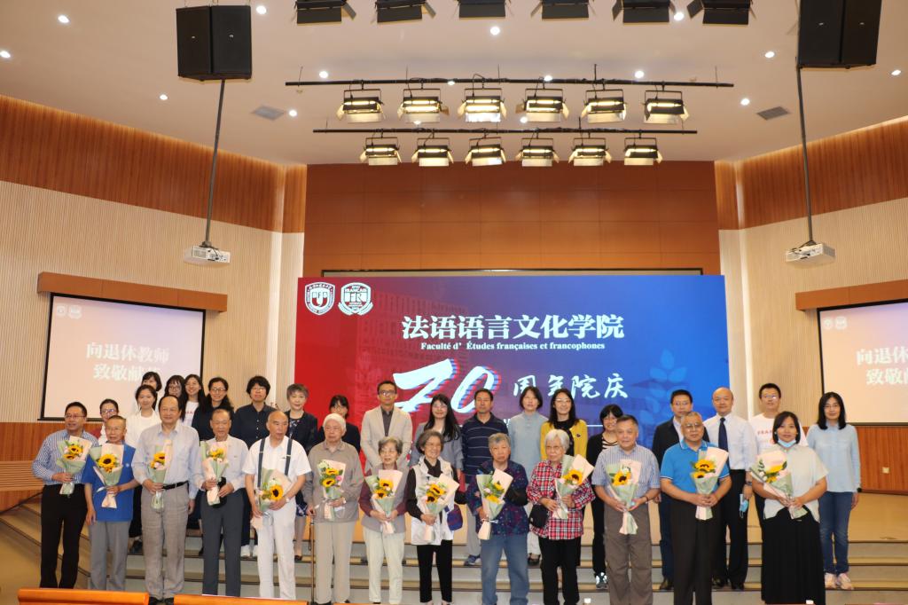 法语学院年轻教师向老教师献花、新老教师同台合照“全家福”