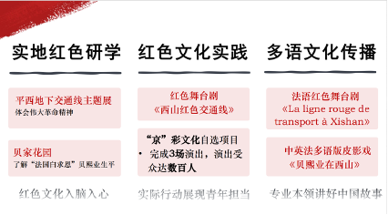 践行初心,服务首都建设。本年度选派100余人次保障中非论坛等重大活动。与海淀区文促中心、史志办合作开发中法人文交流古迹:聚焦“法国白求恩”贝熙业的故事,改编、翻译、排演红色舞台剧《La ligne rouge de transport à Xishan》并在国际研讨会演出;为《贝熙业在西山》法语版皮影戏配音并多次展演,是用外语讲好中国故事的生动实践。