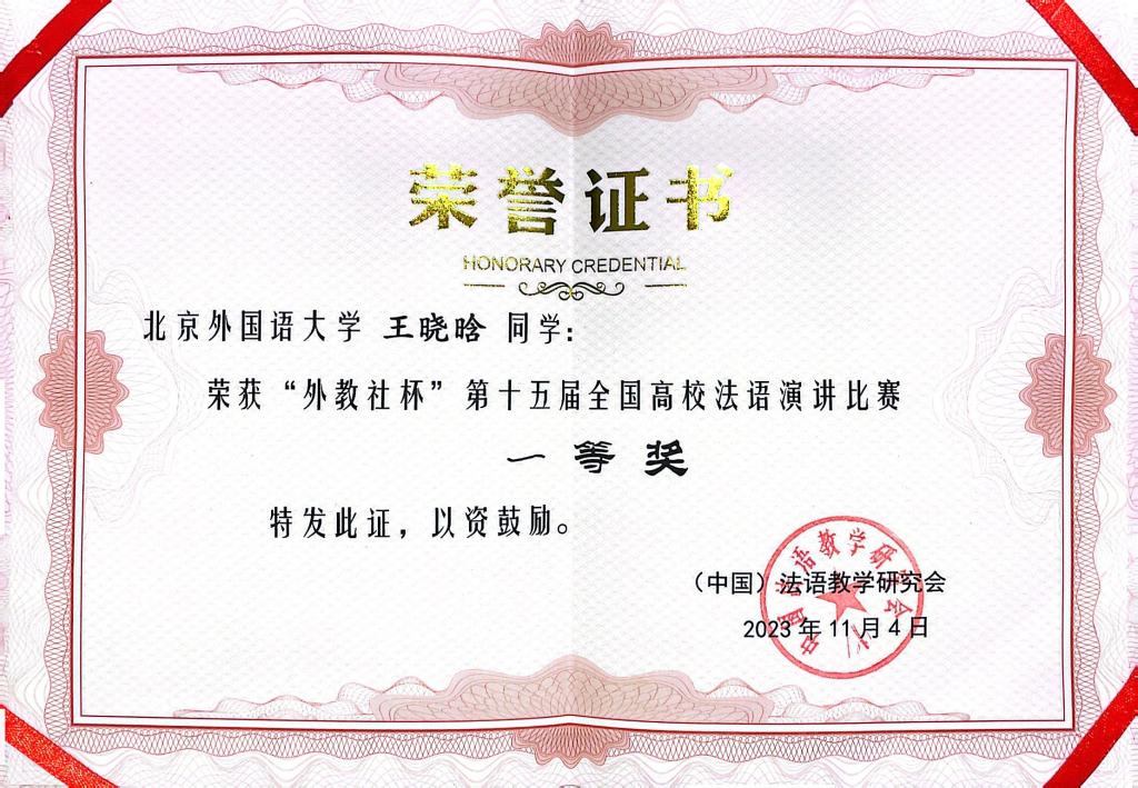 全国高校法语演讲比赛迄今已顺利举办了15届,是法语学科国内高校最高水平的赛事,旨在展示和提升全国高校法语专业教学水平,交流和提高法语专业学生的语言能力和思维能力。王晓晗同学发挥出色,表现了我院学生的风采,也为我校赢得了荣誉。