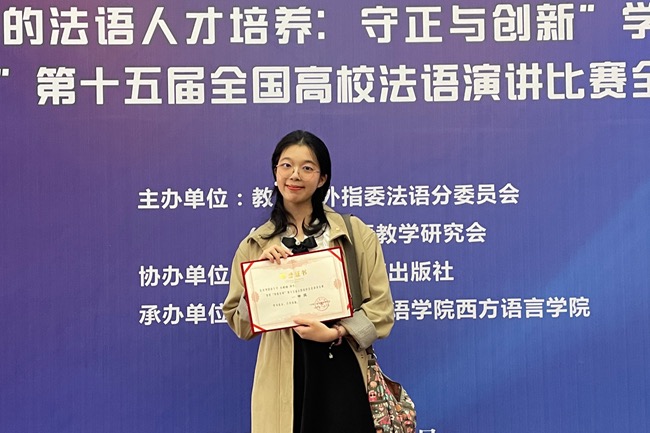 2023年11月4日上午,第十五届“外教社杯”法语演讲大赛总决赛在浙江越秀外国语学院成功举办。本次大赛由教育部外指委法语分委员会和中国法语教学研究会主办,上海外语教育出版社协办,浙江越秀外国语学院西方语言学院承办。我院本科2021级王晓晗同学凭借扎实的语言功底、大方的演讲仪态和出色的临场应变能力,荣获本次比赛一等奖。