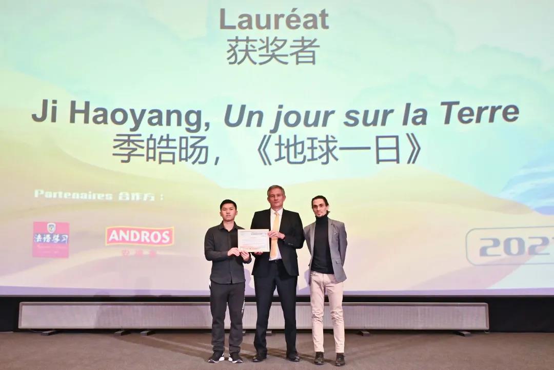 法国驻华大使罗梁阁下(Laurent Bili)为季浩旸同学(左一)颁奖