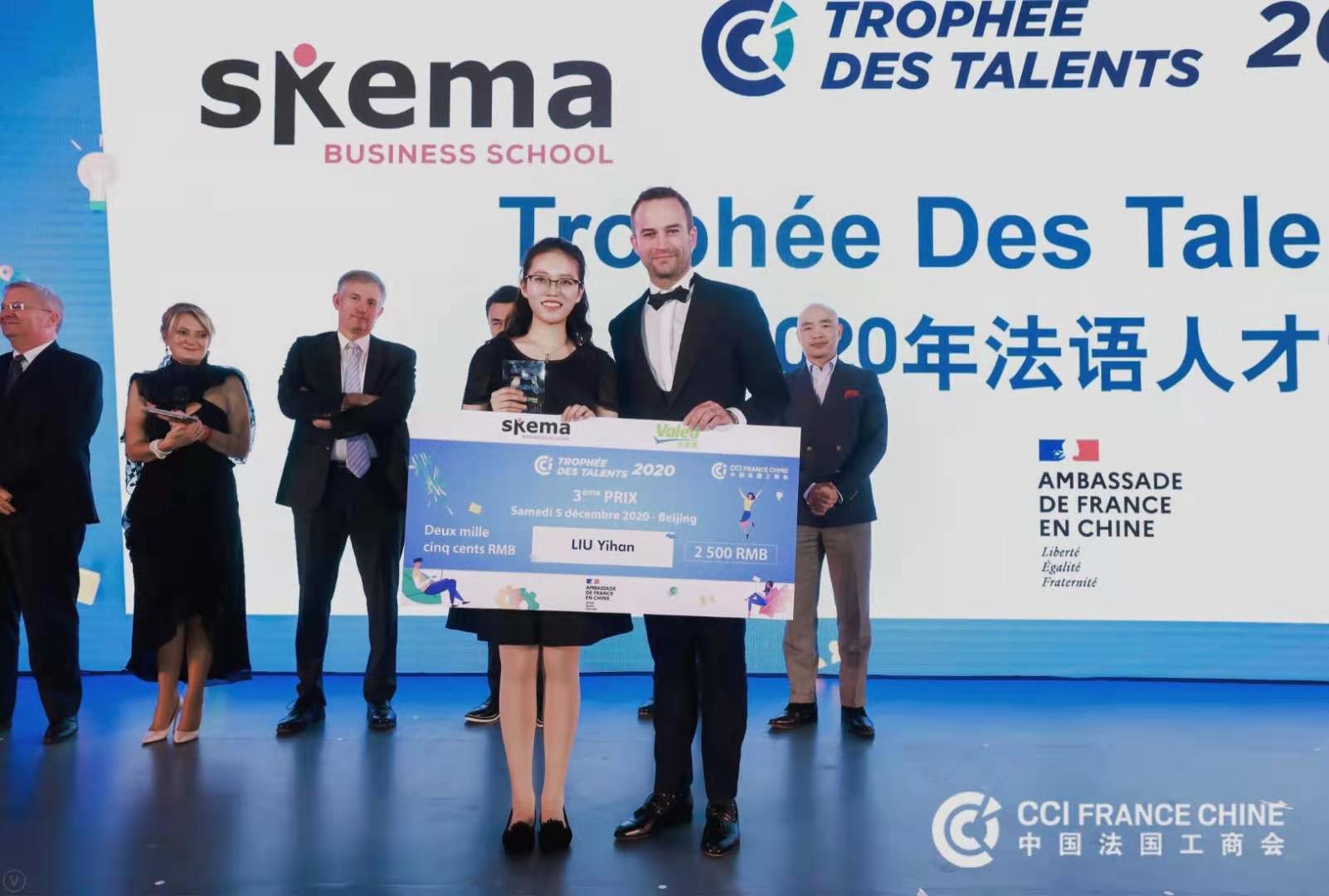 2020年12月5日,由法国工商会创办,法国大使馆、法国SKEMA商学院和法雷奥集团(Valeo)共同举办的第八届中国法语人才竞赛(Trophée des talents 2020)决赛于北京圆满落幕,我院本科2017级刘逸涵同学荣获季军。