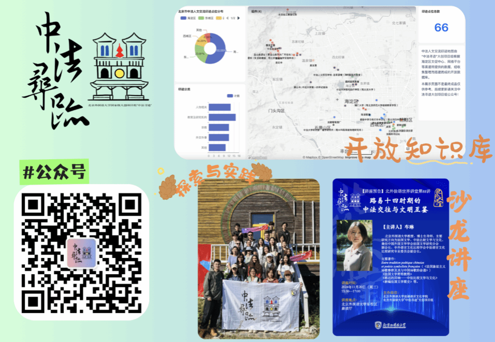 “中法寻迹”:2024年是中法建交60周年、中法文化旅游年。本项目以北京地区为例,通过深挖文献资料与实地探访相结合的方式研究中法人文交流印迹,并基于Maptable平台打造中法交流印迹数据库,发挥专业特长,致力于让更多人了解中法关系、中法友谊,并促进相关文物、历史建筑的保护、修缮和旅游资源开发。