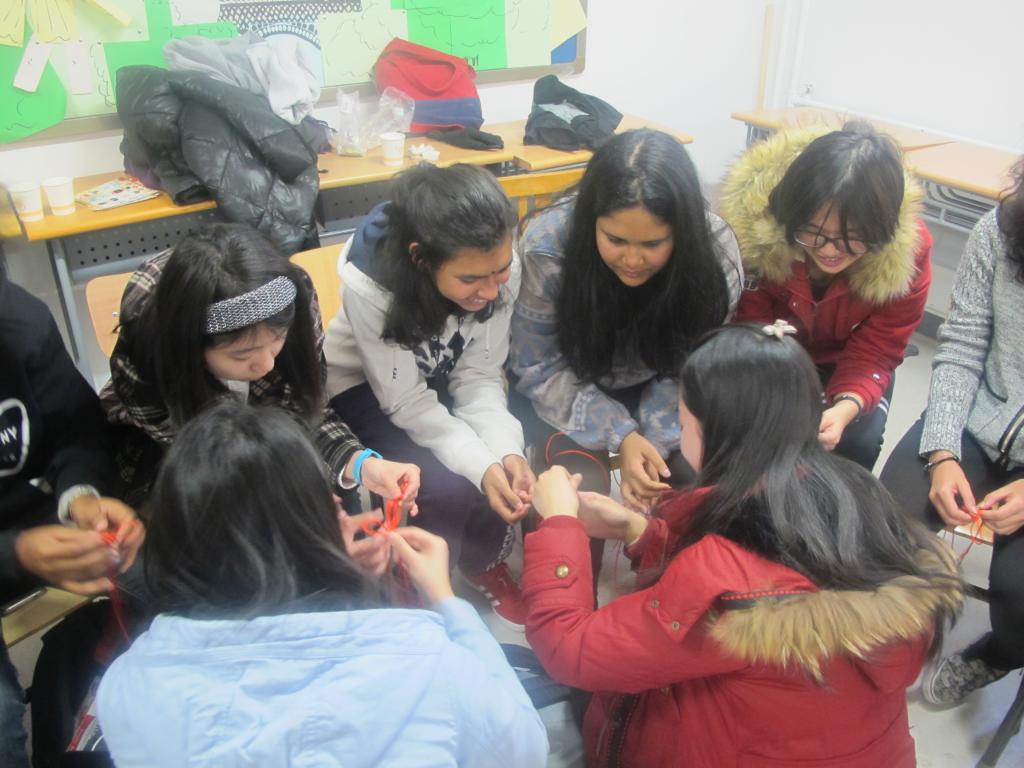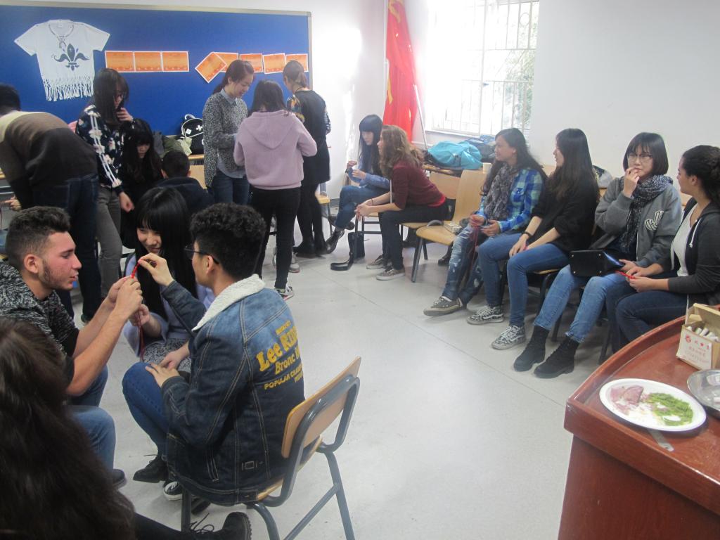 极具挑战性的“逢七必过”游戏后,外联部的同学们开始教大家打中国结。法国学生对此非常感兴趣,围坐一圈认真地学习,有的当场就成功编织出了手链,随即戴在腕上。