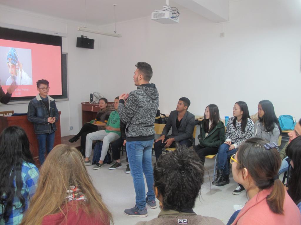 在品尝完颇具北京风味的稻香村糕点后,活动正式开始了。中法学生围坐进行简短的自我介绍,主持人提出要求,介绍人须重复上一人的名字后再报出自己的名字。这种接龙的形式活跃了气氛,也使大家互相熟悉了起来。随后,同学们踊跃地参加“你演我猜”的游戏,法国学生把游戏中出现的“李小龙”、“太极拳”等词演绎得十分传神,引得现场笑声连连。