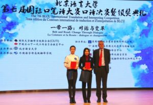 3月30日,北京语言大学第七届国际口笔译大赛口译交传决赛暨颁奖典礼在北京语言大学举行。我系2016级翻译硕士(MTI口译)甄权铨同学获得法汉汉法交替传译组一等奖。