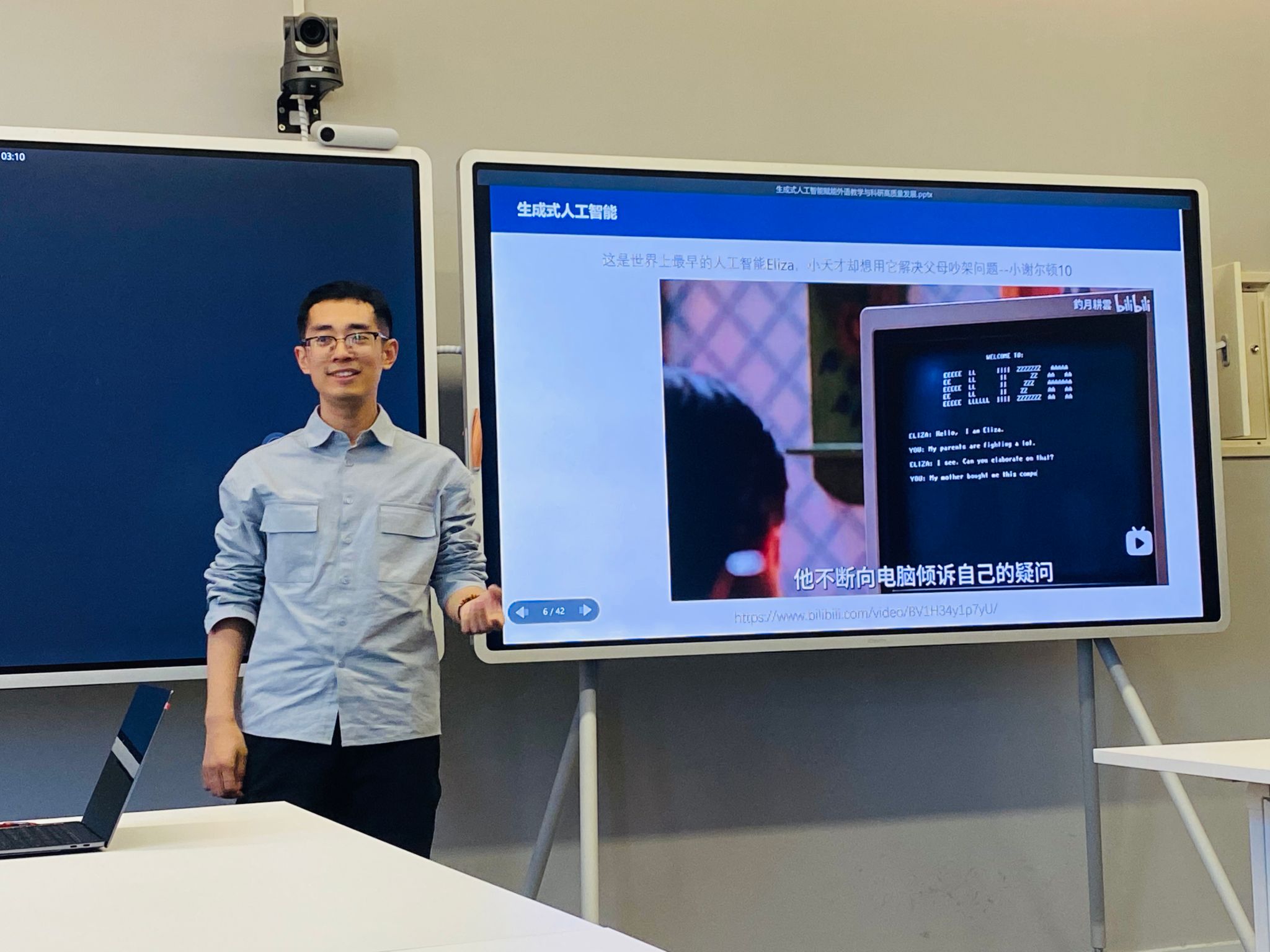 参观结束后,王琦副教授为法语学院教师们做了题为“生成式人工智能赋能外语教学与科研高质量发展”的精彩讲座。在讲座中,王琦老师首先介绍了生成式人工智能的起源,从早期的机器学习模型到如今的深度学习架构,详细阐述了其技术演进的脉络。接着,他展示了生成式人工智能在视频生成、图像生成、歌曲生成等领域的前沿应用,通过生动的案例让法语学院教师们直观感受到人工智能的强大能力。在讲座的后半部分,王琦老师还着重探讨了教师与人工智能的关系。他强调,尽管人工智能技术发展迅速,但教师的角色不可替代。教师应更加关注学生的需求和情感,将人工智能作为辅助工具,而不是完全依赖它。他还深入分析了传统外语教学中存在的问题,如教学方法单一、学习资源有限等,并探讨了生成式人工智能如何赋能外语教学与科研的高质量发展。王琦老师指出,生成式人工智能可以为外语教学提供更加个性化、多样化的学习资源,帮助教师更好地因材施教,提升教学效果。
